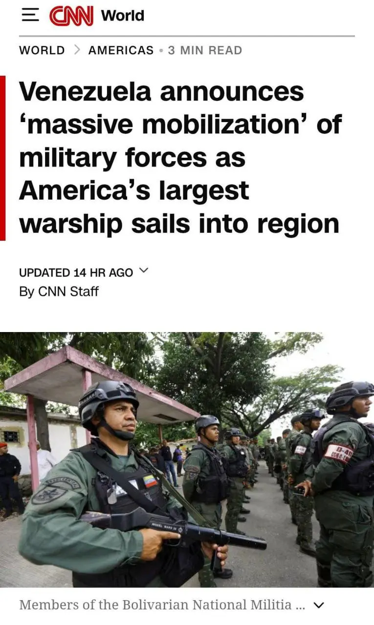 Это сделано в ответ на рост военного присутствия США в Карибском море, сообщает CNN. Министр обороны страны заявил, что распоряжение отдал лично диктатор Мадуро.