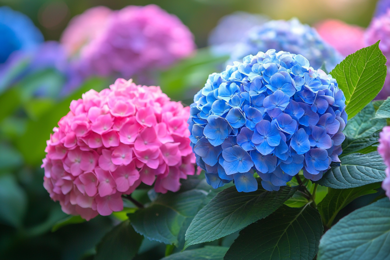 Крупнолистные гортензии красивы, но более требовательны. Их окраска может меняться в зависимости от уровня pH почвы: при кислой почве цветки становятся синими, при щелочной — розовыми.